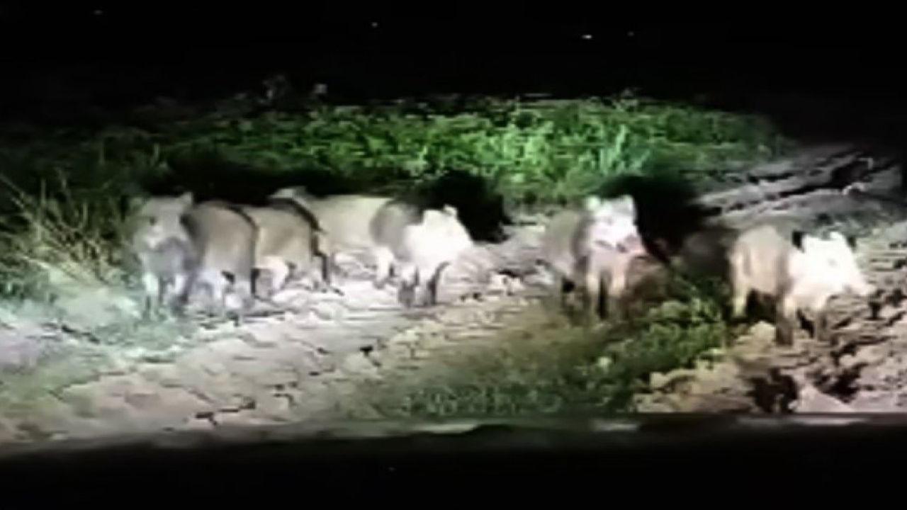 Çekilen görüntülerde, domuz sürüsünün ekili alanlarda gezindiği ve beslendiği görülüyor. Ancak beslendikten sonra karanlıkla birlikte domuzlar gözden kayboluyor.