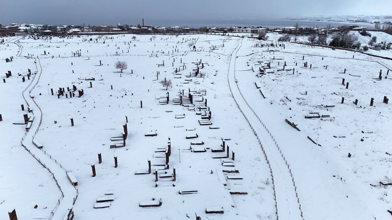 Karla bütünleşen Selçuklu Meydan Mezarlığı havadan da görüntülenirken, ortaya kartpostallık manzaralar çıktı.