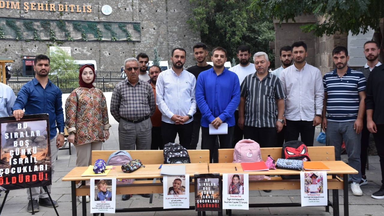 81 ilde eş zamanlı başlayan etkinlik çerçevesinde Bitlis’te Tarihi Ulu Cami meydanında bir araya gelen AK Parti Bitlis Gençlik Kolları tarafından alana boş okul sıraları yerleştirerek üzerine kalem ve defterler bırakıldı. Pankartların bulunduğu etkinlikte vatandaşlar tarafından Gazzeli çocuklar için defterlere notlar yazıldı.