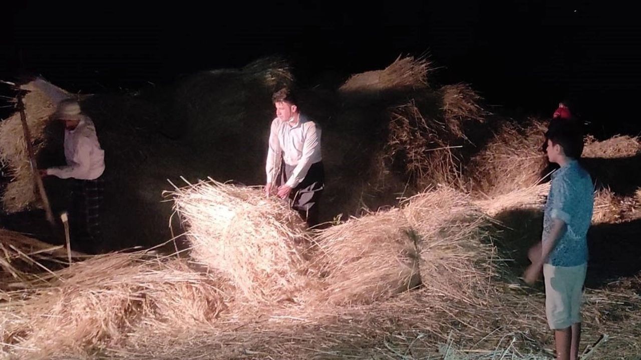 Çiftçiler, akşam saatlerinde imece usulüyle tarlalarını biçiyor, hasat etikleri buğday ve arpaları traktörlere bağladıkları patozlarla döverek tahıl ve saplarını ayırıyor.
