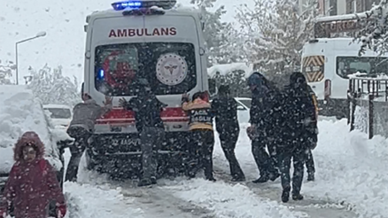 Kaygan zemin nedeniyle ilerlemekte güçlük çeken ambulansın yardımına sağlık ekipleri ve yoldan geçen vatandaşlar koştu. Ambulans, ekiplerin ve vatandaşların itmesiyle güçlükle hareket ettirilerek yoluna devam edebildi.