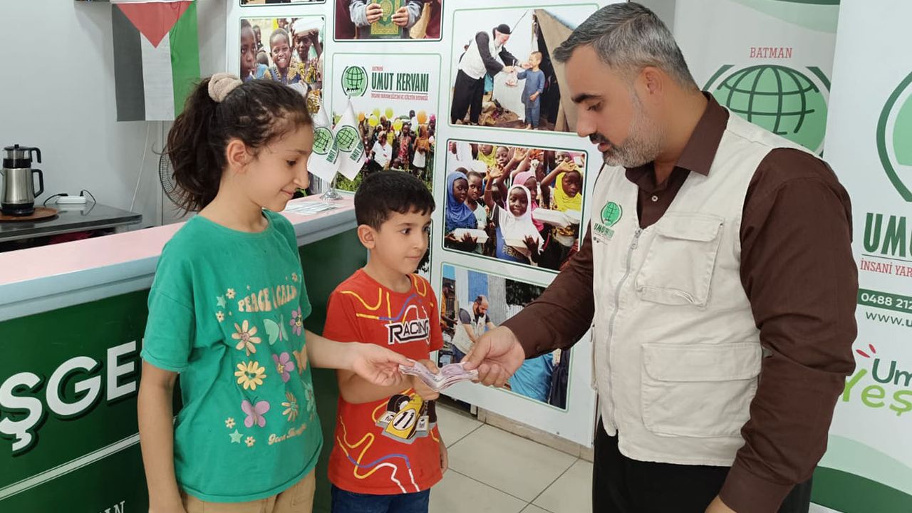Kumbaralarında biriktirdikleri harçlıklarını "Gazze Gemisi"ne destek amacıyla Umut Kervanı Batman Temsilcisi Rıdvan Üzümcü’ye teslim eden çocuklar, büyüklerinden takdir topladı.