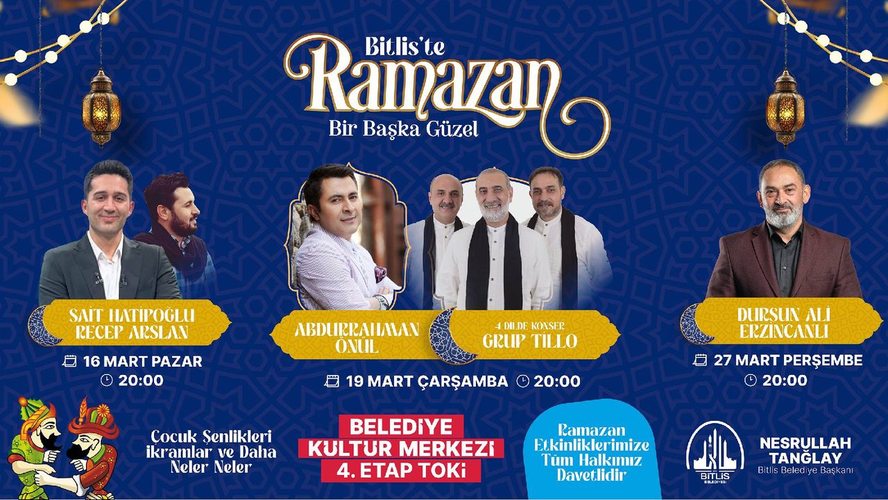 Bitlis Belediyesi tarafından organize edilen etkinlik Ramazan boyunca 3 farklı günden oluşacak. Her programda çocuk etkinlikleri ve ikramlar olacak. 4 Etap TOKİ, Belediye Kültür Merkezi'nde düzenlenecek ramazan etkinliklerin ilki 16 Mart Pazar saat: 20:00'de Sait Hatipoğlu & Recep Aslan Konseri ile başlayıp Abdurrahman Önül ve Grup Tillo'nun 4 dilde konseri ile devam edecek.,