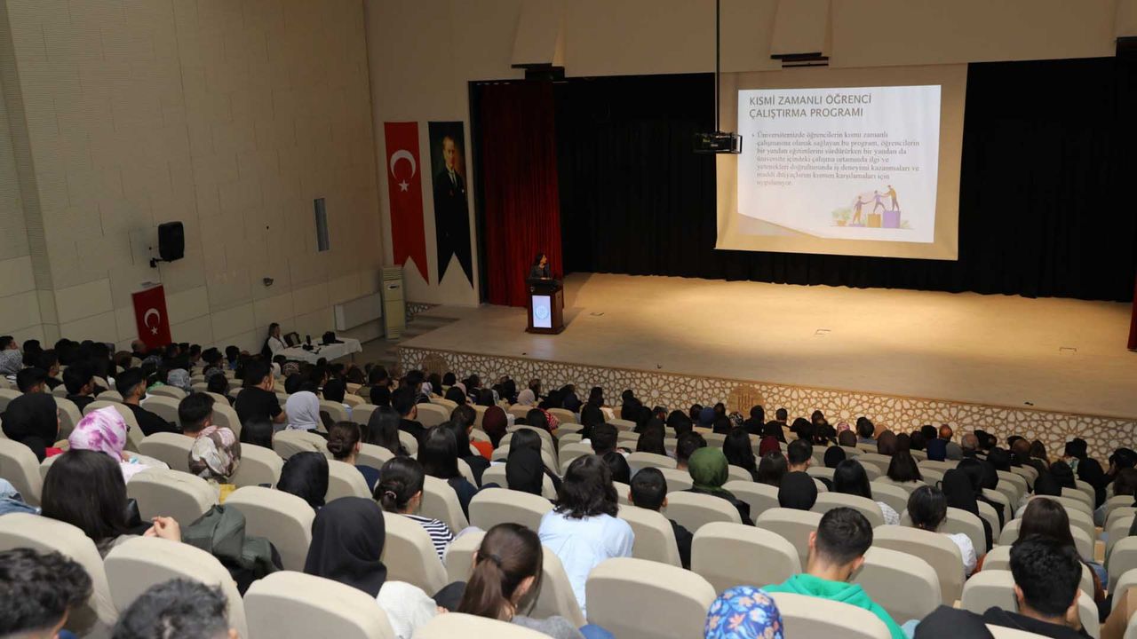 Oryantasyon kapsamında Sağlık, Kültür ve Spor Dairesi Başkanlığı’ndan Psikolog Buse Demet Azun, Öğrenci İşleri Daire Başkanlığı Şube Müdürü Kezban Kaval, Öğrenci Dekanlığı Dekanı Dr. Öğr. Üyesi Fırat Ünsal ile Kütüphane ve Dökümantasyon Daire Başkanlığı’ndan Kütüphaneci İkram Batır sunum yaptı. Öğrencilere birimlerin işleyişi hakkında bilgi verilerek üniversite yaşamlarında izleyebilecekleri yollar aktarıldı.