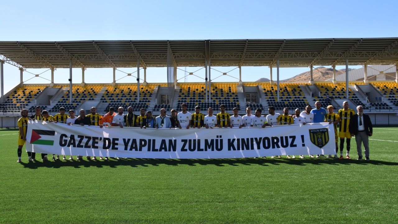 Kurban kesimiyle açılışı yapılan stadyumda Saat 14.00’te başlayan karşılaşma öncesi futbolcular, “Gazze’de yaşanan soykırımı kınıyoruz” yazılı pankartla sahaya çıkarak destek mesajı verdi. Tribünleri dolduran taraftarlar da pankarta alkışlarla eşlik etti.