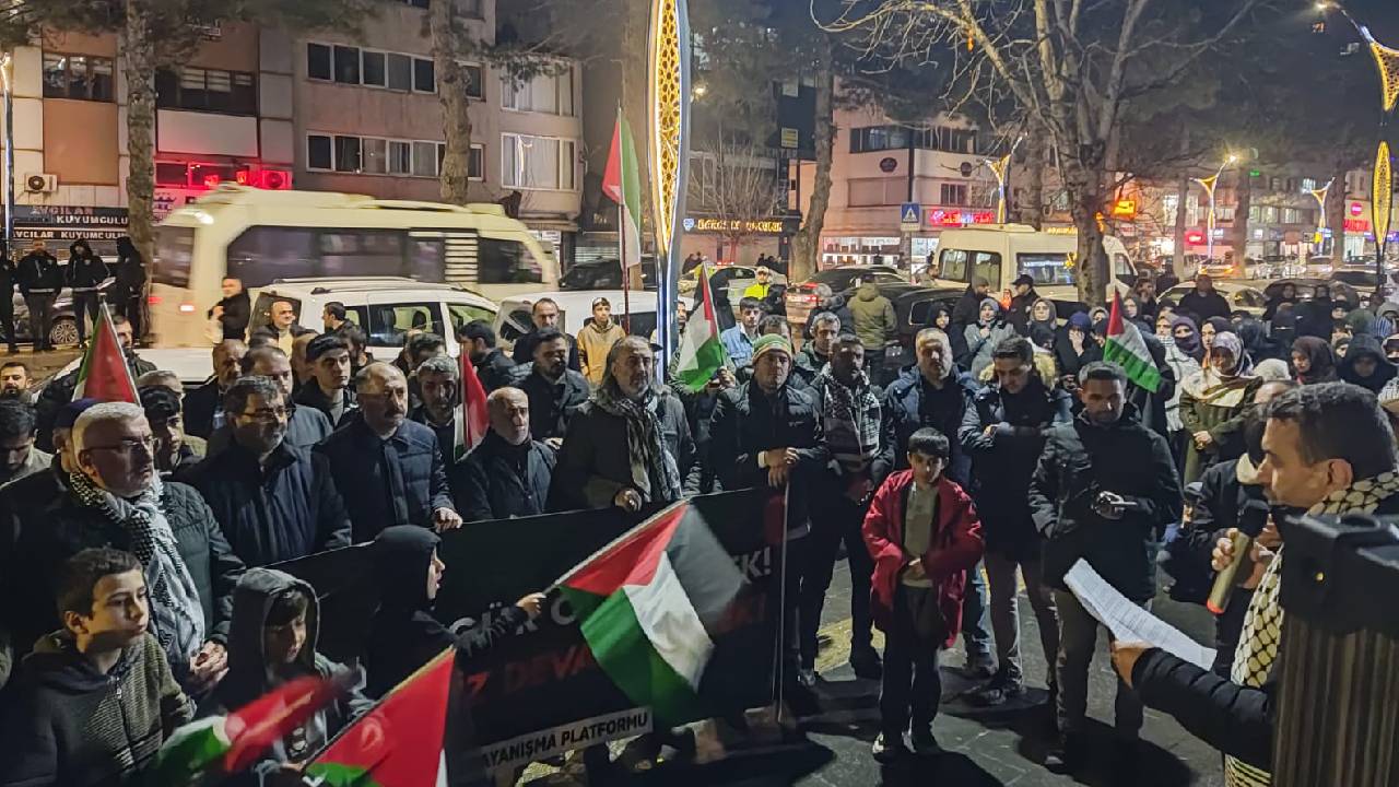İşgalci katillerin Gazze’ye yönelik gerçekleştirdiği son katliamları protesto etmek amacıyla Bitlis Filistin Platformu öncülüğünde toplanan kalabalık Teravih namazının ardından Tatvan İbadullah Cami önünde bir araya geldi. Ellerinde Filistin bayrakları ile tekbirler eşliğinde Filistin Parkı'na kadar yürüyüş yapan kalabalık burada basın açıklaması yaptı.