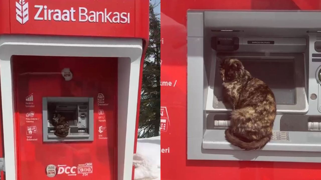 Bir bankaya ait ATM’nin işlem bölmesine yerleşen kedi, para çekme ve yatırma haznesinin üzerine çıkarak işlem yapmak için gelen vatandaşlara keyifli dakikalar sundu.
