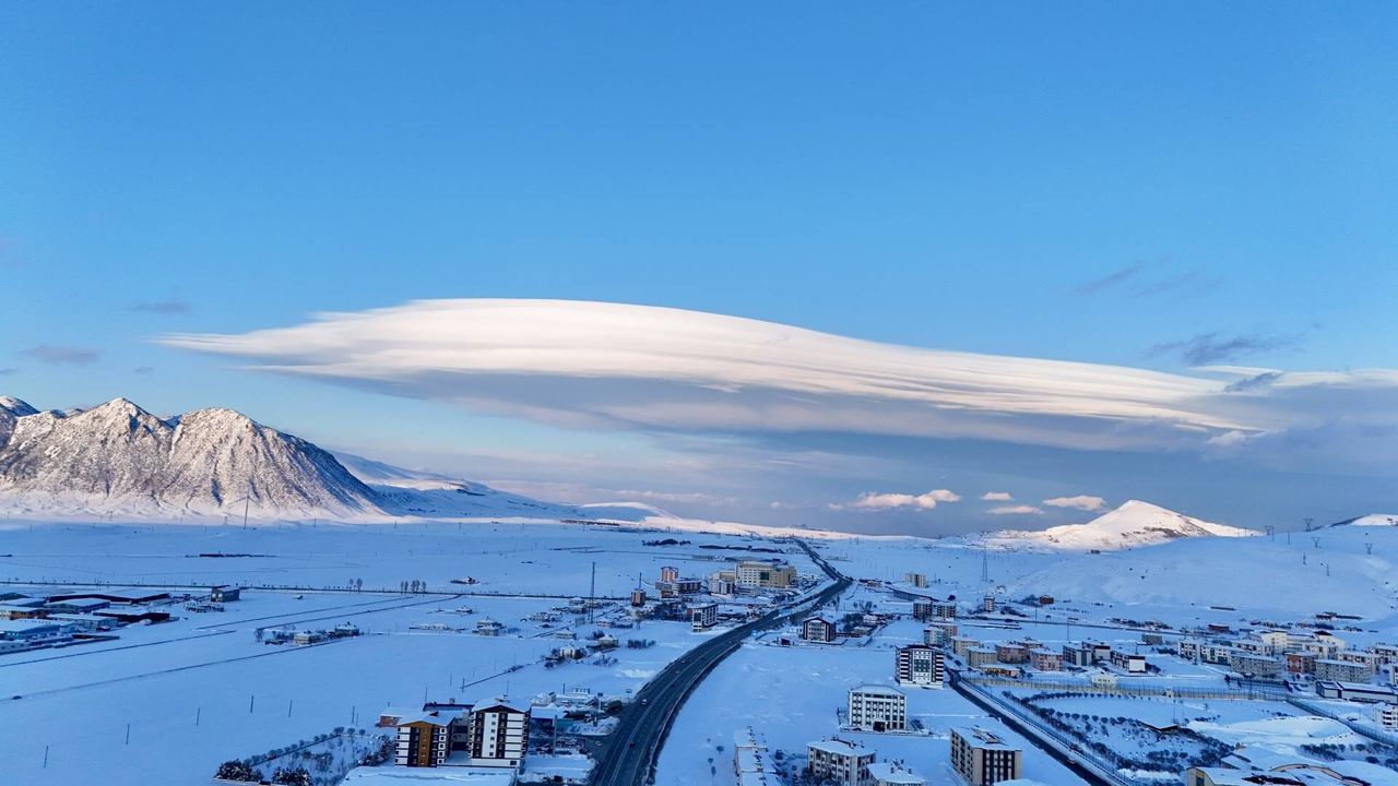 Bitlis’te kar yağışının etkisiyle dağlar bembeyaz bir örtüyle kaplanırken, gökyüzü de bir başka güzellik sundu. Maviliklerin arasında beliren mercek bulutu, karla kaplı dağların zirveleriyle adeta birleşerek izleyenleri kendine hayran bıraktı.