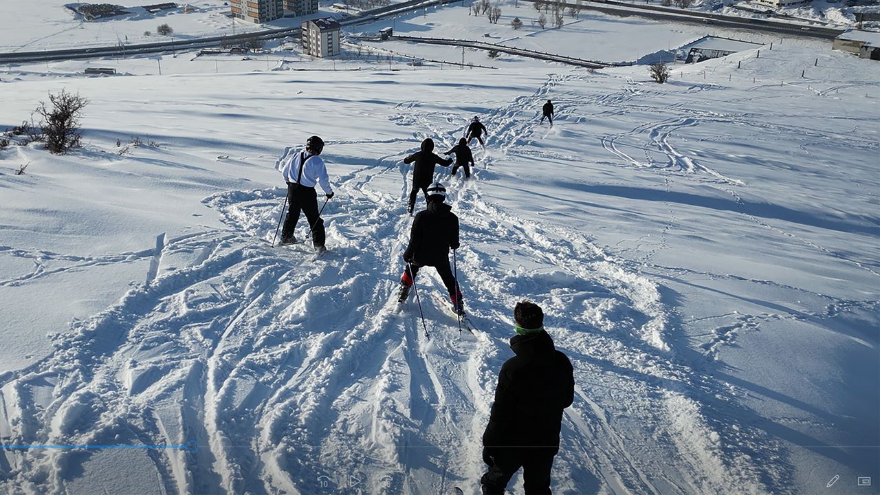 Bitlis’te adrenalin tutkusuyla yapılan tehlikeli bir deneme, dron kamerasına yansıdı. 11 kişiden oluşan bir genç grubu, zeminin kayak yapmaya uygun olmadığı yüksek rakımlı dağlık bir alanda kendilerini yamaçtan aşağıya bıraktı.
