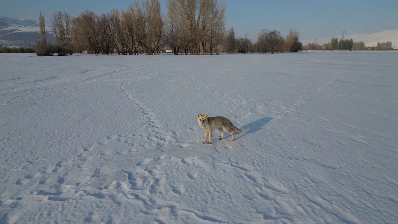 Erzurum’un Tortum ilçesinde karla kaplı arazide avlanan kızıl tilki, dronla görüntülendi. Sessizce yiyecek arayan tilki, havadan gelen sesi fark edince panikledi.