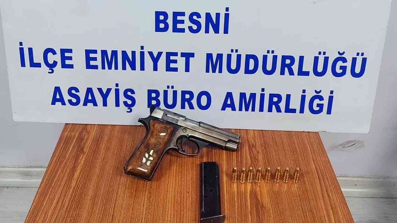 Adıyaman'ın Besni İlçe Emniyet Müdürlüğü ekipleri, Dumlupınar Mahallesi Atatürk Caddesi üzerinde şüphe üzerine bir aracı durdurdu. Yapılan aramada araçta bulunan 1 adet tabanca ve 8 adet fişek ele geçirildi.