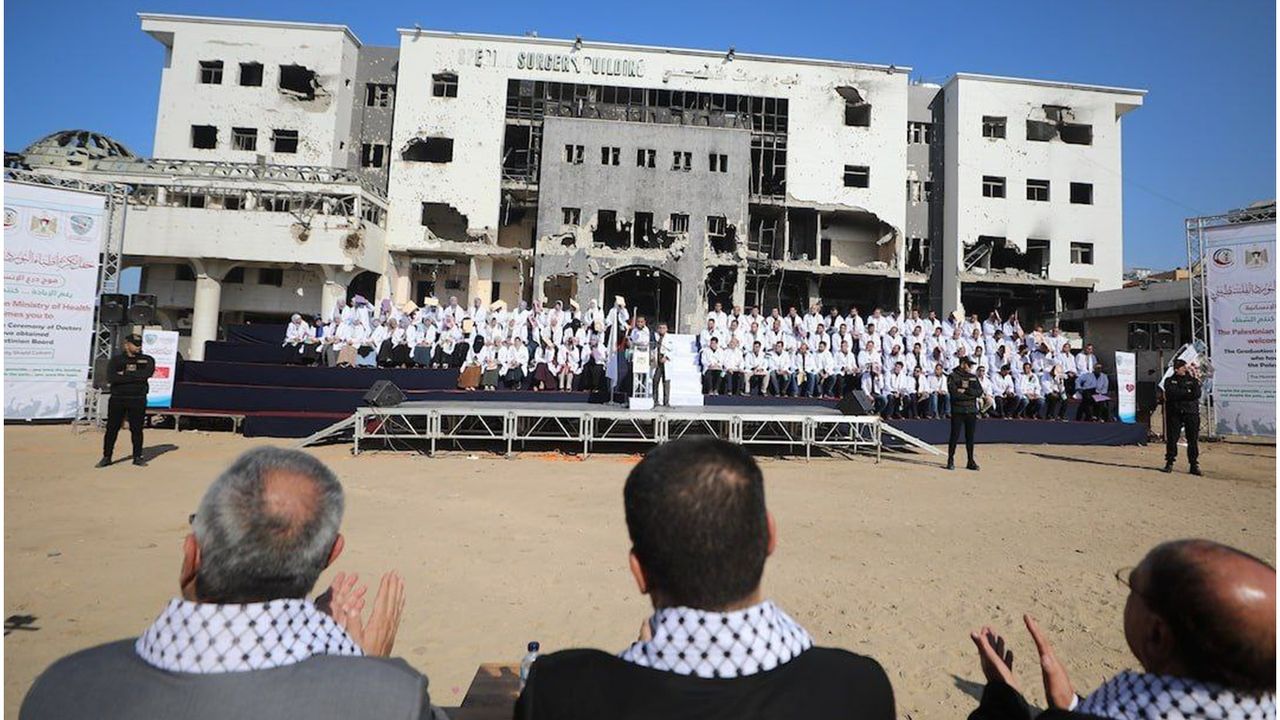 Gazze’de sağlık altyapısının ağır saldırılarla hedef alındığı bir dönemde, umut veren bir mezuniyet töreni gerçekleştirildi. Gazze Sağlık Bakanlığı, Gazze kentindeki El-Şifa Tıp Kompleksi’nin avlusunda Filistin Tıp Kurulu’ndan mezun olan doktorlar için diploma töreni düzenledi.