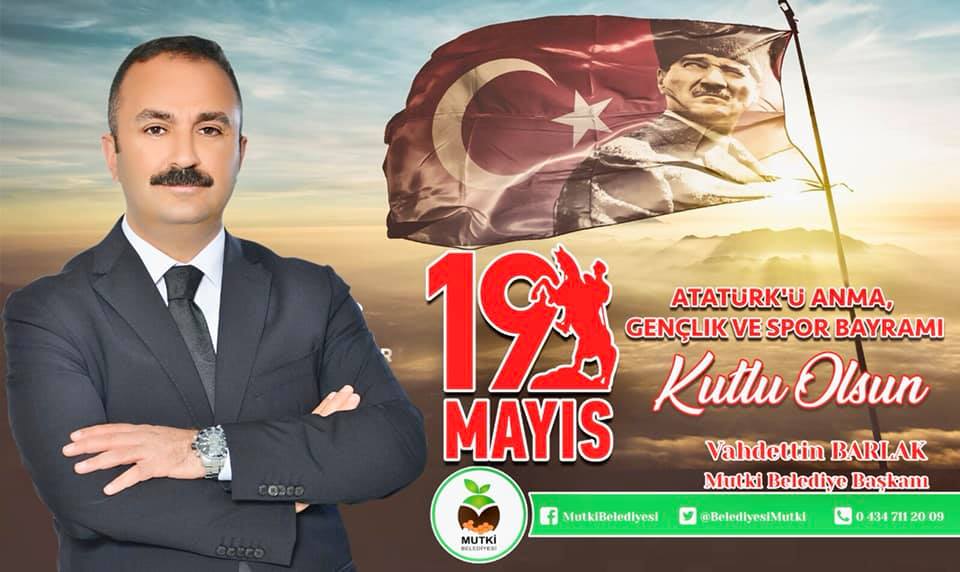 Mutki Belediye Başkanı Vahdettin Barlak: Gazi Mustafa Kemal ATATÜRK başta olmak üzere, Milli mücadelemizin bütün kahramanlarını rahmet ve şükranla anıyor, #19MAYIS Atatürk'ü Anma, Gençlik ve Spor Bayramı'nı yürekten kutluyorum.