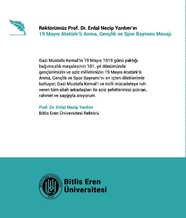 Bitlis Eren Üniversitesi Rektörü Erdal Necip Yardım: Gazi Mustafa Kemal'in 19 Mayıs 1919 günü yaktığı bağımsızlık meşalesinin 101. yıl dönümünde gençlerimizin ve aziz milletimizin 19 Mayıs Atatürk'ü Anma, Gençlik ve Spor Bayramı'nı en içten dileklerimle kutluyor; Gazi Mustafa Kemal'i ve milli mücadeleye ruh veren tüm silah arkadaşları ile aziz şehitlerimizi şükran, rahmet ve saygıyla anıyorum.
