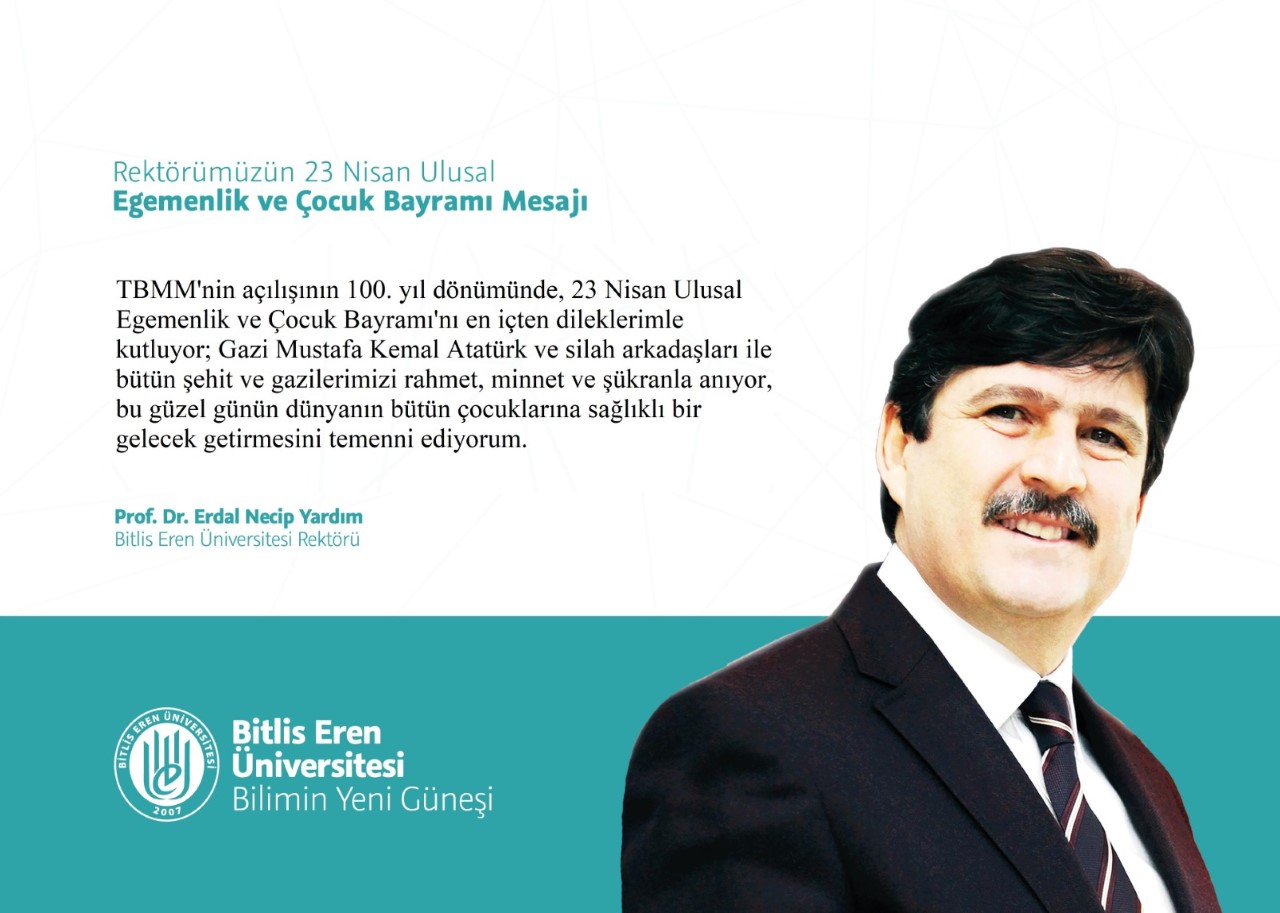 Bitlis Eren Üniversitesi Rektörü Erdal Necip Yardım: TBMM'nin açılışının 100. yıl dönümünde, 23 Nisan Ulusal Egemenlik ve Çocuk Bayramı'nı en içten dileklerimle kutluyor; Gazi Mustafa Kemal Atatürk ve silah arkadaşları ile bütün şehit ve gazilerimizi rahmet, minnet ve şükranla anıyor, bu güzel günün dünyanın bütün çocuklarına sağlıklı bir gelecek getirmesini temenni ediyorum.