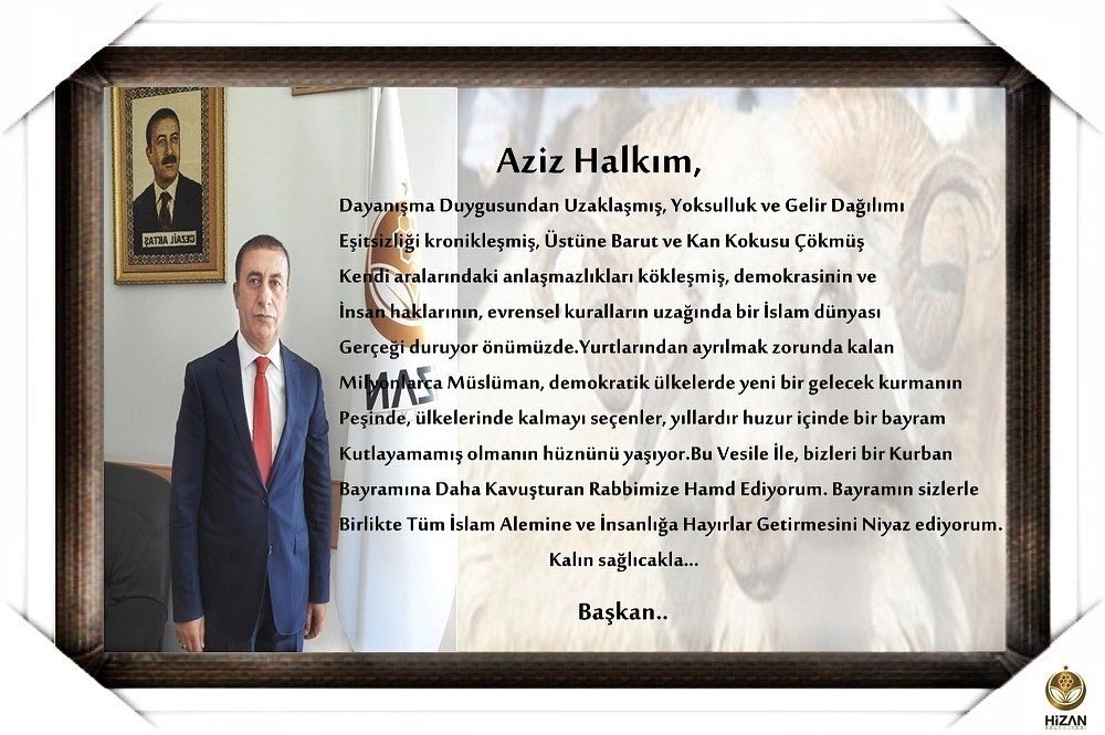 Bitlis İl Genel Meclis Başkanı Cemalettin Kinç: Dünyayı saran Pandemi sürecinden kaynaklı ziyaretlerin, fiziki yakinlaşmanin olamayışından dolayı buruk geçecek olan "Kurban Bayramın", özellikle bu manevi atmosferde kardeşlik hukukunun güçlenmesini, hüznün dualarla coşkuya dönüşerek, Ülkemize, Milletimize, İslam alemine, tüm insanlığa bariş, huzur ve özellikle SAĞLIK, mutluluk getirmesini, ALLAH' tan temenni ediyorum. Hayırlı Bayramlar Dilerim.