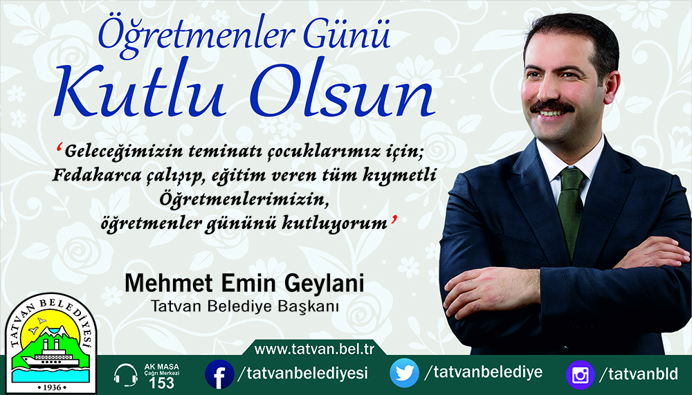 Tatvan Belediye Başkanı Mehmet Emin Geylani, 24 Kasım Öğretmenler Günü dolayısıyla bir kutlama mesajı yayınladı. Dünyanın en kutsal vazifelerinden birini yapan tüm öğretmenlerin Öğretmenler Günü’nü kutlayan Belediye Başkanı Geylani açıklamasında, “Dünyanın en onurlu mesleklerin başında gelen öğretmenlik; emek, sabır ve hoşgörü isteyen, bedeli hiçbir maddi karşılıkla ölçülemeyecek kadar değerli, saygın bir meslektir. Sorumluluğu diğer mesleklerle kıyaslanamayan, ülkemizin muasır medeniyetler seviyesine çıkmasını, donanımlı bir neslin oluşmasının temeli olan öğretmenlerimize, gösterdikleri fedakârlıklar için şükranlarımızı sunuyoruz. Öğretmenlerimiz, geleceğimiz olan çocuklarımız ile gençlerimizi yetiştiren ve onların bilinçle şekillendirilmesine yön veren kutsal bir meslek grubunun mensuplarıdır. Çocuk ve gençlerimizin yaşamlarını yön vermek gibi yüce bir görevi yerine getirmekte olan değerli öğretmenlerimizin saygınlığı, toplumdaki yeri, rolü ve önemini tartışılmazdır. Geleceğimizin teminatı çocuklarımız için fedakarca çalışıp eğitim veren başta ebediyete intikal etmiş öğretmenlerimizi saygıyla, rahmetle anıyor ve tüm öğretmenlerimizin Öğretmenler Günü’nü kutluyorum.” İfadelerini kullandı.