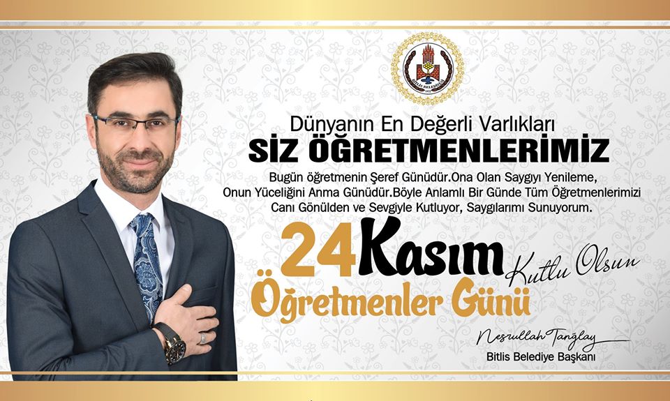Geleceğimizin teminatı olan çocuklarımız için; fedakarca çalışıp eğitim veren tüm kıymetli öğretmenlerimizin, '24 Kasım Öğretmenler Günü'nü kutlar, sevgi ve saygılarımı sunarım. Necati GÜRSOY Adilcevaz Belediye Başkanı