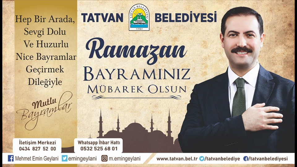 Tatvan Belediye Başkanı Mehmet Emin Geylani: Rahmet, merhamet ve bereket ayı olan Ramazan-ı Şerif’in sonuna gelerek; hamdolsun, memleket olarak sevgiyle, muhabbetle kucaklaşacağımız bir bayrama daha kavuştuk. Ramazan Bayramınızı kutluyor; bu mübarek günlerin, tüm İslam alemiyle birlikte bizlerin de birliğine, beraberliğine, kardeşliğine vesile olmasını Cenab-ı Allah’tan diliyorum.