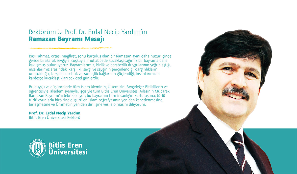 Bitlis Eren Üniversitesi Rektörü Prof. Dr. Erdal Necip Yardım'ın Ramazan Bayramı Mesajı: Başı rahmet, ortası mağfiret, sonu kurtuluş olan bir Ramazan ayını daha huzur içinde geride bırakarak sevgiyle, coşkuyla, muhabbetle kucaklaşacağımız bir bayrama daha kavuşmuş bulunuyoruz. Bayramlarımız, birlik ve beraberlik duygularının yoğunlaştığı, insanlarımız arasındaki karşılıklı sevgi ve saygının perçinlendiği, dargınlıkların unutulduğu, karşılıklı dostluk ve kardeşlik bağlarının güçlendiği, insanlarımızın kardeşçe kucaklaştıkları çok özel günlerdir. Bu duygu ve düşüncelerle tüm İslam âleminin, Ülkemizin, Saygıdeğer Bitlislilerin ve öğrencisiyle, akademisyeniyle, memuruyla, işçisiyle tüm Bitlis Eren Üniversitesi Ailesinin Mübarek Ramazan Bayramı'nı tebrik ediyor; bu bayramın tüm insanlığın kurtuluşuna, türlü türlü oyunlarla birbirine düşürülen İslam coğrafyasının yeniden kenetlenmesine, birleşmesine ve Ümmet'in yeniden dirilişine vesile olmasını diliyorum.