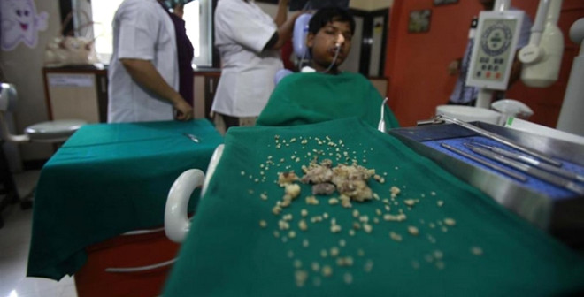 Hindistan'da doktorlar inanılmaz bir dünya rekoruna şahit oldular. Yüzünün sağ tarafı şiştiği için hastaneye giden 17 yaşındaki Ashique Gavai'nin, azı dişindeki büyümeyi gören doktorlar hayret içerisinde kaldı. 7 saat süren bir operasyonun ardından, Gavai'nin çenesinden, boyu 2-3 cm olan 232 adet küçük diş çıkarıldı.