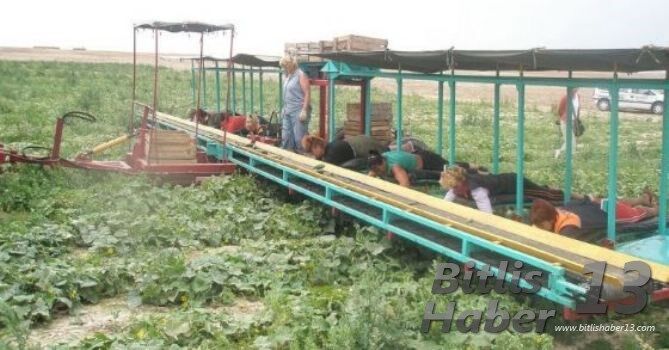 Toplanan salatalıklar, işçilerin önlerinde hareket eden bantlara bırakılıyor.