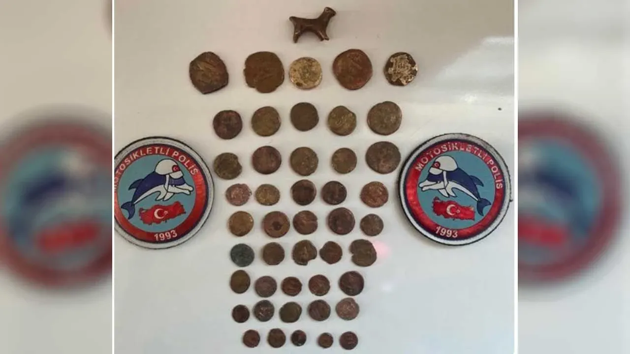 İl Emniyet Müdürlüğünün sosyal medya hesabından yapılan paylaşıma göre, Artuklu ilçesinde şüphe üzerine durdurulan araçta arama gerçekleştirildi. Yapılan aramada, tarihi eser olduğu değerlendirilen hayvan figürlü heykelin yanı sıra farklı renk, ebat ve kabartmalara sahip 45 sikke bulundu.