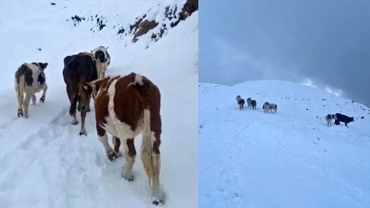 Hizan’a bağlı Yoğurtlu ve Akbaş köylerinin kırsal kesimlerinde hayvanlarını otlatan vatandaşlar, ansızın bastıran kar yağışına hazırlıksız yakalandı. Kısa sürede bölgeyi beyaza bürüyen kar, meradaki büyükbaş hayvanların yürümesini güçleştirdi. Çobanlar ve hayvan sahipleri, kar örtüsü altında ilerlemekte zorlanan hayvanları kontrollü şekilde köylere doğru yönlendirdi.