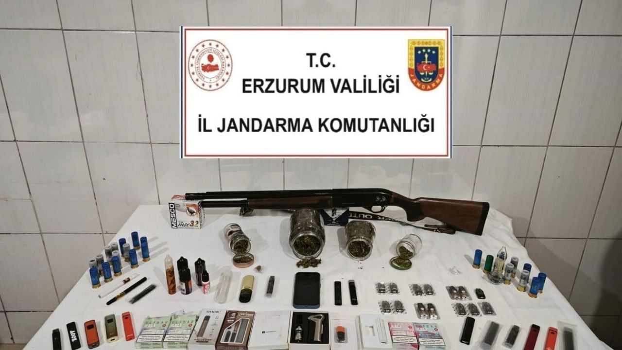 Erzurum Cumhuriyet Başsavcılığı koordinesinde Pazaryolu ilçesinde gerçekleştirilen operasyonda; 167 gram kubar esrar, 8 gram kokain, 1 uyuşturucu kullanma aparatı, 12 boş likit şişesi, 1 ruhsatsız av tüfeği, 67 adet 12 kalibre av tüfeği fişeği, 29 kaçak elektronik sigara cihazı, 19 sigara cihazı başlığı ve 1 cep telefonu ele geçirildi.