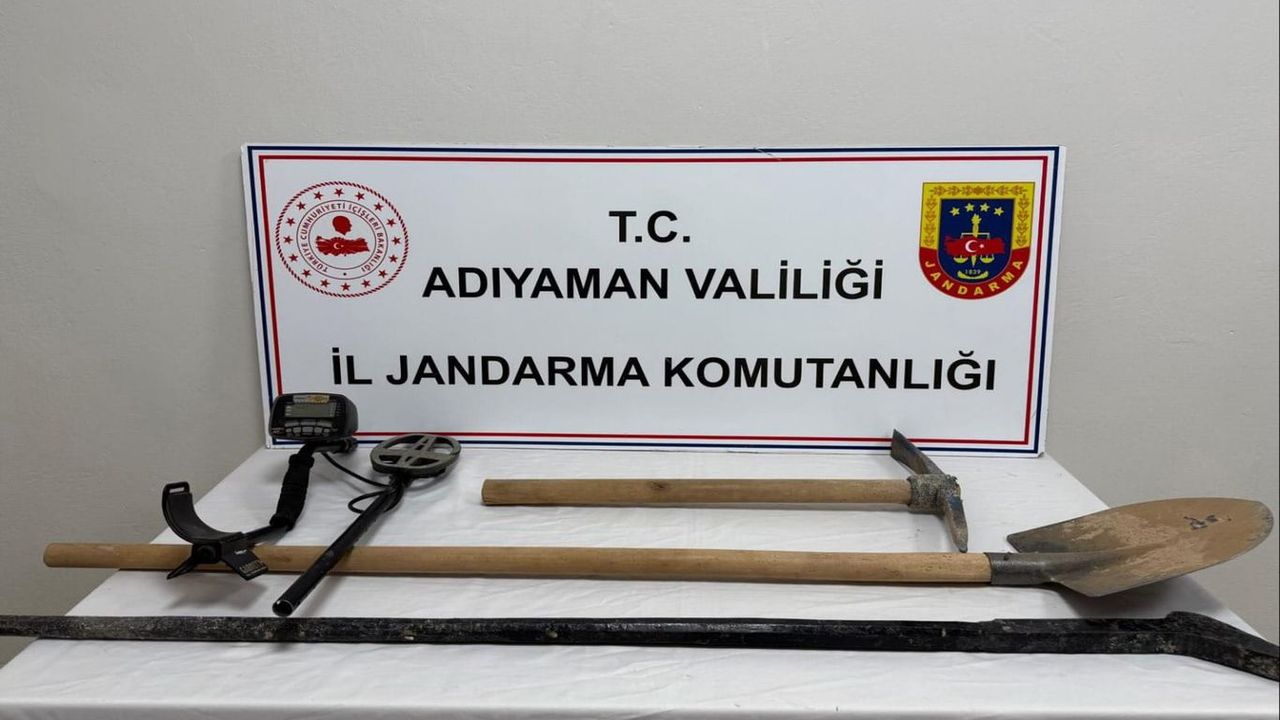 Adıyaman il merkezinde tarihi eser bulmak amacıyla kaçak kazı yapan şüphelilerin kullandığı 1 adet dedektör, 1 adet kürek, 1 adet kazma ve 1 adet demir aparata el konuldu.