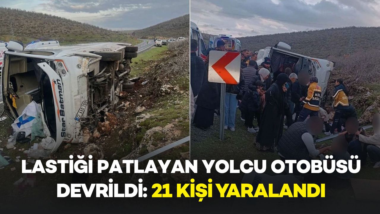 Mardin’in Midyat ilçesinde meydana gelen trafik kazasında yolcu otobüsünün devrilmesi sonucu 21 kişi yaralandı. Kazanın, aracın lastiğinin patlaması sonucu gerçekleştiği öğrenildi.