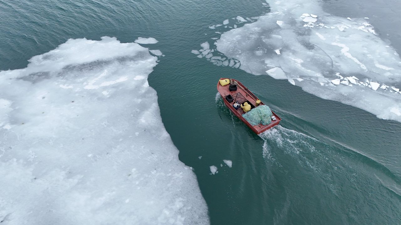 Göl yüzeyinde oluşan büyük buz kütleleri arasında ilerleyen balıkçı tekneleri ve parçalanan buz tabakaları, dron ile görüntülenerek eşsiz manzaralar ortaya koydu.