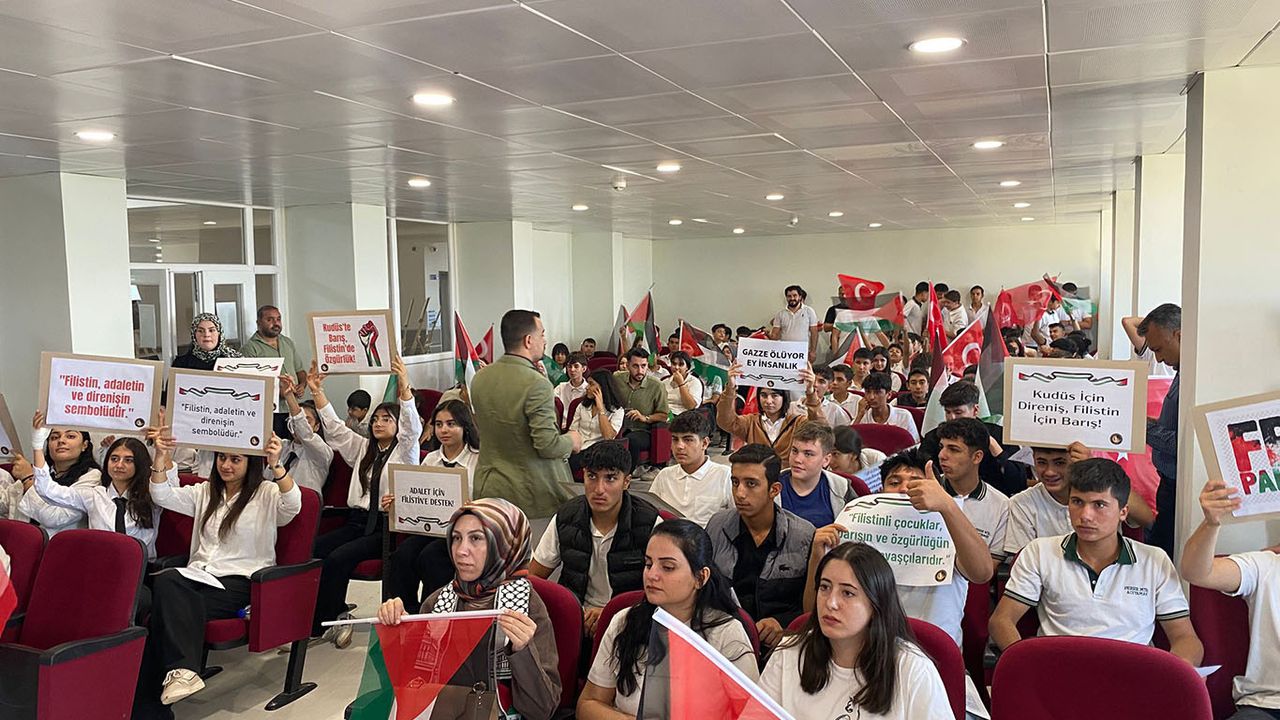 Okulun konferans salonunda gerçekleştirilen etkinlikte öğrenciler, Filistin halkına destek mesajları vererek Gazze’de yaşanan insanlık dramına dikkat çekti. Program kapsamında salon Filistin bayrakları ve tematik afişlerle süslendi. Öğrenciler, Filistin temalı şarkılar seslendirdi; barış, özgürlük ve dayanışma çağrıları yapıldı.