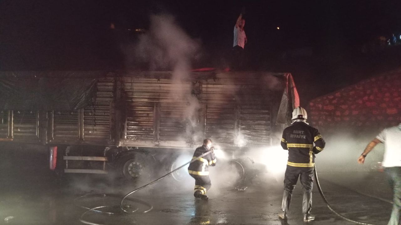 Edinilen bilgilere göre, 46 ZD 401 plakalı tır, Siirt-Veyselkarani kara yolunda ilerlediği sırada motor kısmından dumanlar yükselmeye başladı. Sürücünün aracı yol kenarına çekmesinin ardından alevler kısa sürede büyüyerek dorsedeki buğday çuvallarına sıçradı.