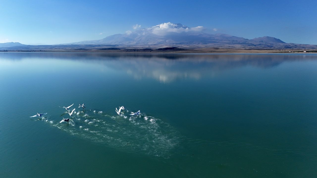 Bu dönemde Arin Gölü’ne gelen ötücü kuğular, sakin duruşları ve zarif hareketleriyle doğaseverlerin ilgi odağı oldu. Dronla çekilen görüntülerde kuğuların berrak su üzerinde süzülüşü, arka planda ise zirvesi karla kaplı Süphan Dağı’nın tüm görkemi yer aldı. Kuğuların asaleti ile dağın ihtişamı aynı karede buluşunca, ortaya adeta kartpostallık manzaralar çıktı.