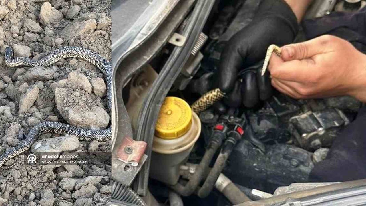 Olay yerine gelen itfaiye ekipleri ile birlikte tamirciler, aracın motor kısmında bulunan yılanı güvenli bir şekilde çıkarıp doğaya salındı. (AA)