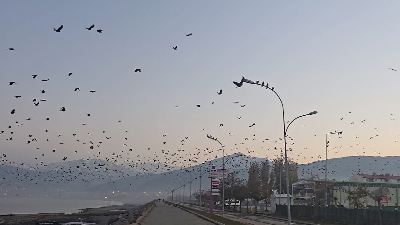 Tatvan'da Sahil kesiminde ansızın gökyüzüne doğru havalanan binlerce karga, oluşturdukları yoğun sürü hareketiyle adeta gökyüzünü kararttı.
