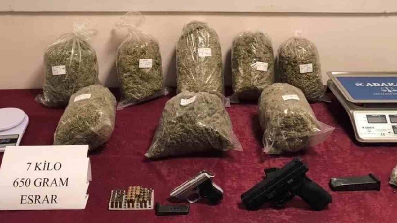 Yapılan aramalarda ise 7 kilo 670 gram esrar, 5 adet ruhsatsız tabanca, 1 adet pompalı tüfek, 1 adet kılıç, 2 adet hassas terazi, 62 adet fişek ile 50 bin TL para ele geçirildi. (İLKHA)