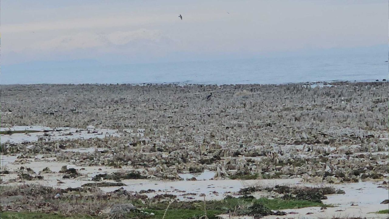 Türkiye'nin en büyük gölü olan Van Gölü'nün Adilcevaz sahilinde yaşanan yağışlara rağmen su seviyesinin düşmesiyle birlikte ortaya çıkan mikrobiyalitler dikkat çekiyor.