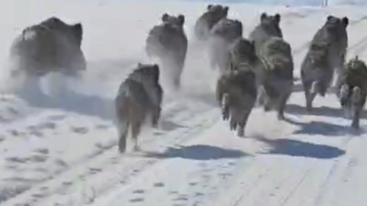 Sürü, bir sürücü tarafından cep telefonu kamerasıyla kaydedilirken, doğal yaşam alanlarında yeterli yiyecek bulamayan yaban domuzlarının rotalarını yerleşim yerlerinin sınırlarına çevirdiği ifade edildi.