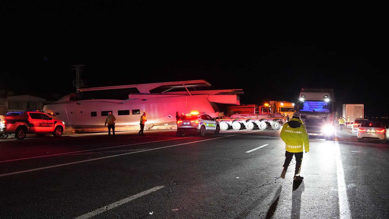 İhbar üzerine bölgeye trafik ekipleri sevk edilerek güvenlik önlemleri alındı. Karşılarında yat taşıyan bir tır gören sürücüler ise şaşkınlıklarını gizleyemedi. Yapılan çalışmaların ardından tır yeniden çalıştırılarak karayoluna çıkarıldı ve güvenli bir alana park edilmek üzere yoluna devam etti.