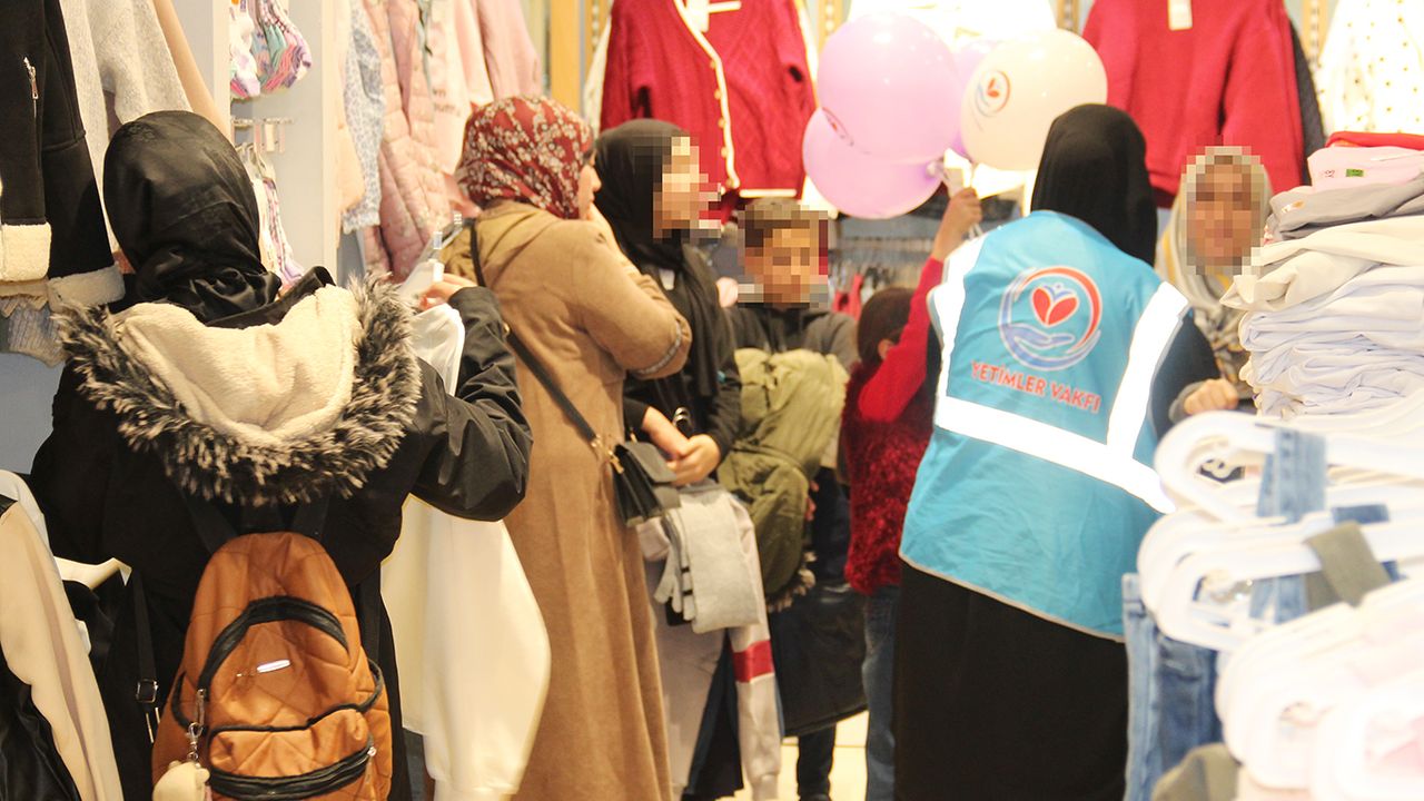 Yardım faaliyetlerinden yararlanan çocuklar, aileleriyle birlikte bir giyim mağazasına giderek istedikleri kıyafet ve ayakkabıları seçme imkânı buldu.